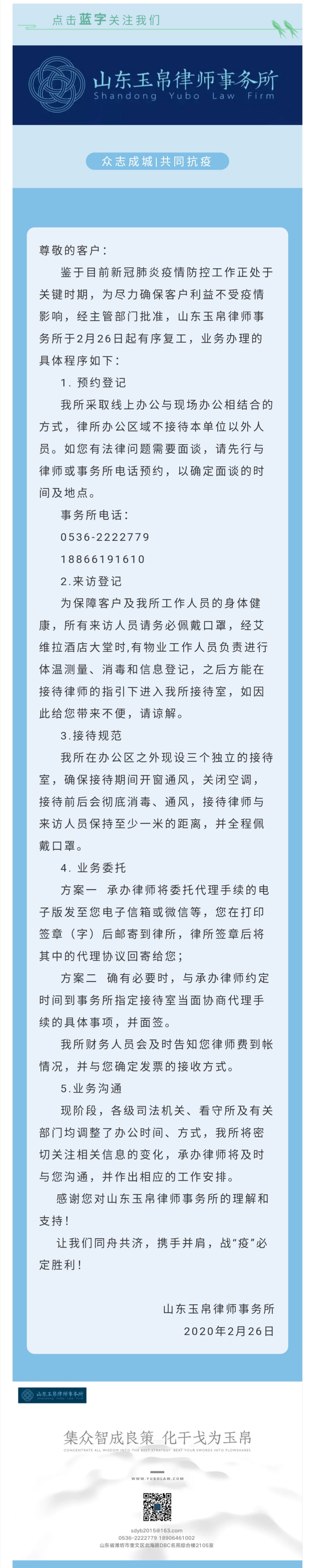 关于玉帛律所复工后业务办理程序告知函
