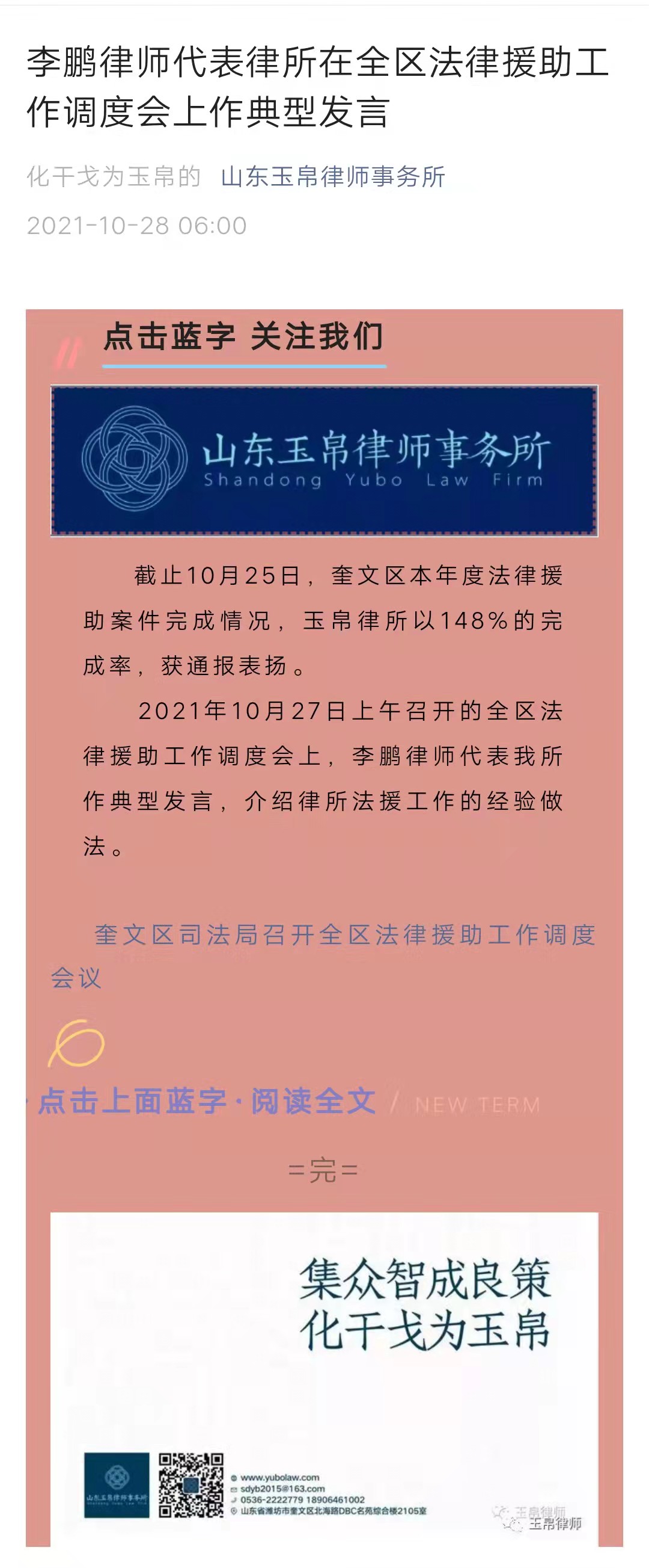 李鹏律师代表律所在全区法律援助工作调度会上作典型发言
