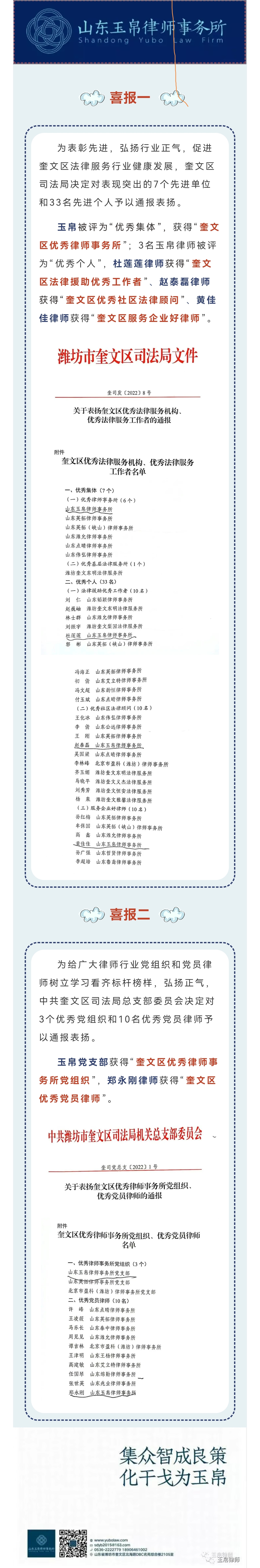 玉帛律所及党支部、多名律师受奎文区司法局通报表扬