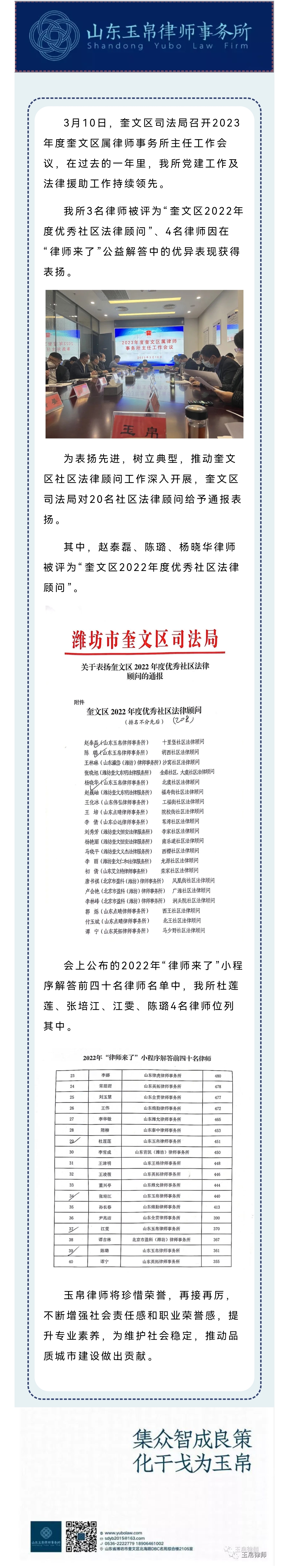 赵泰磊等3名律师被评为优秀社区法律顾问、杜莲莲等4名律师获通报表扬