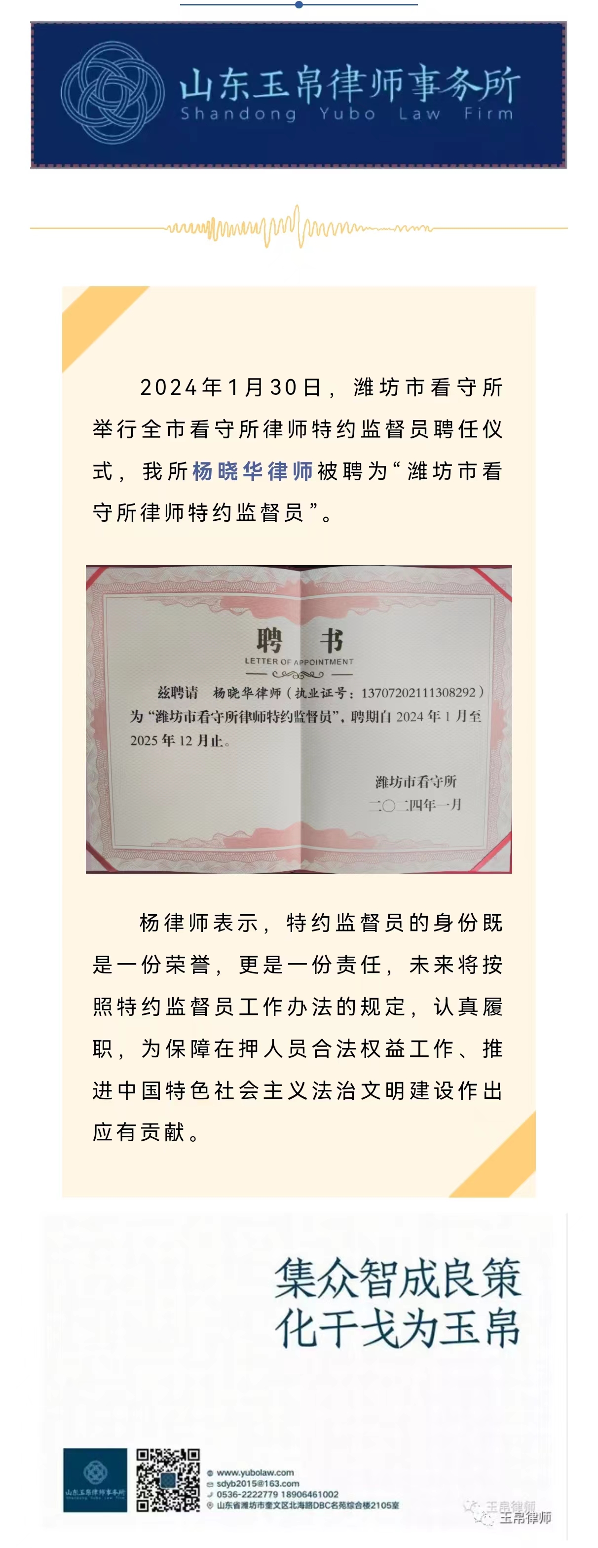 杨晓华律师被聘为“潍坊市看守所律师特约监督员”