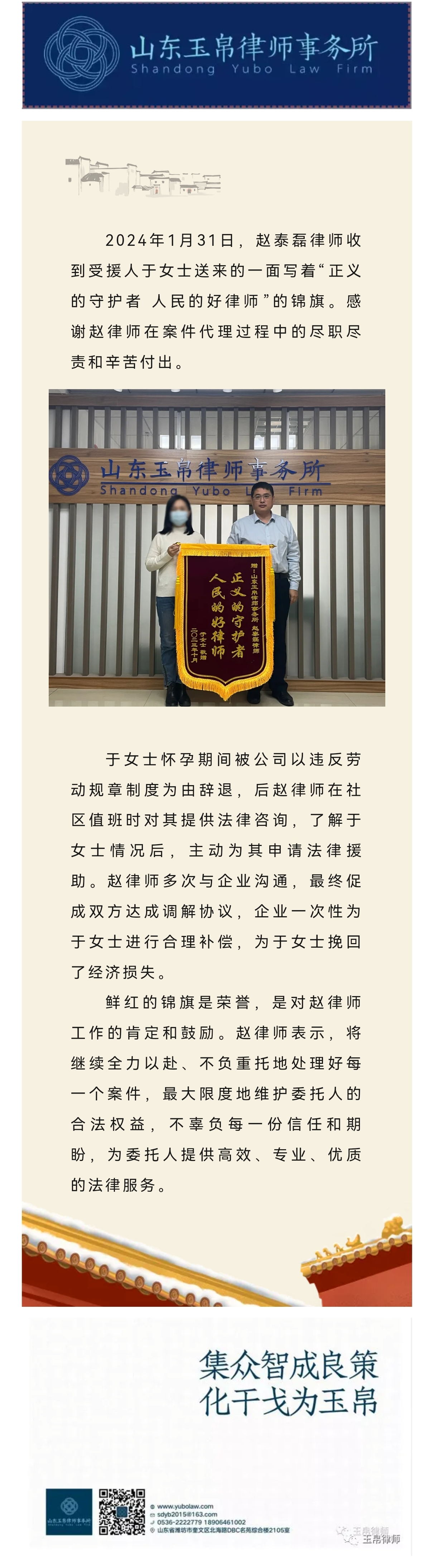 正义的守护者 人民的好律师——赵泰磊律师获赠锦旗