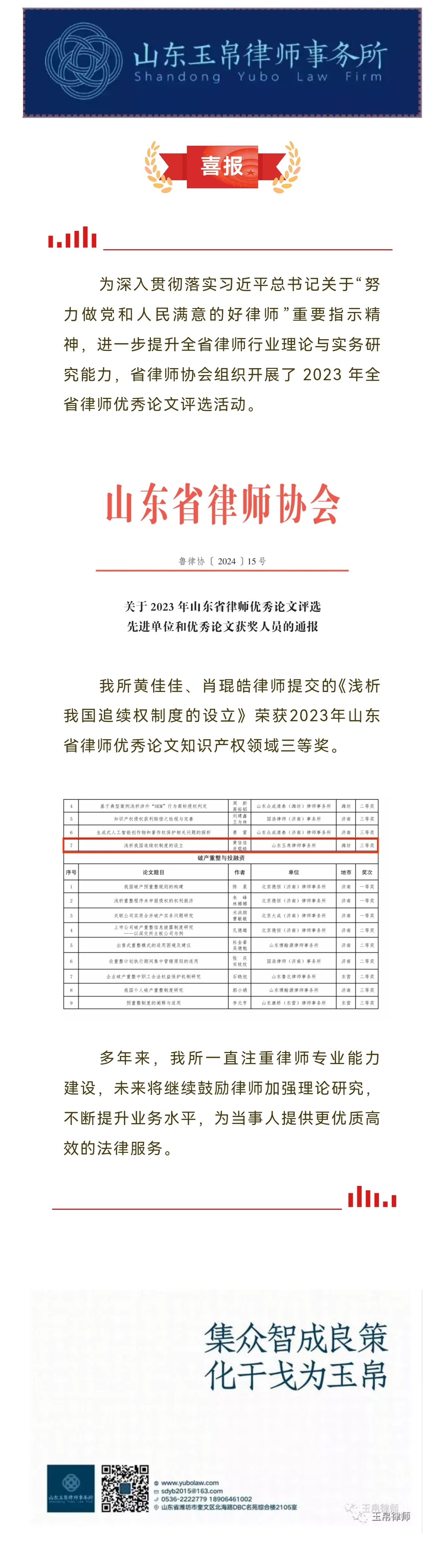 黄佳佳、肖琨皓律师荣获2023年山东省律师优秀论文评选三等奖