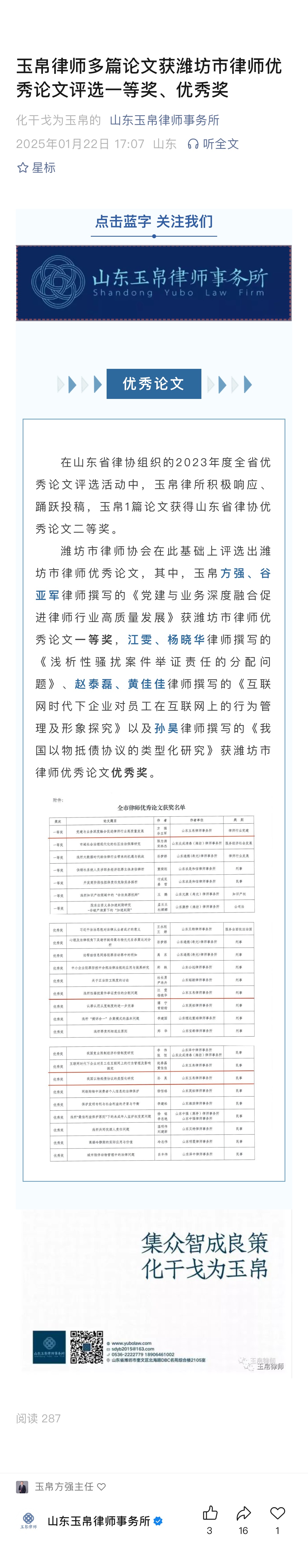 玉帛律师多篇论文获潍坊市律师优秀论文评选一等奖、优秀奖
