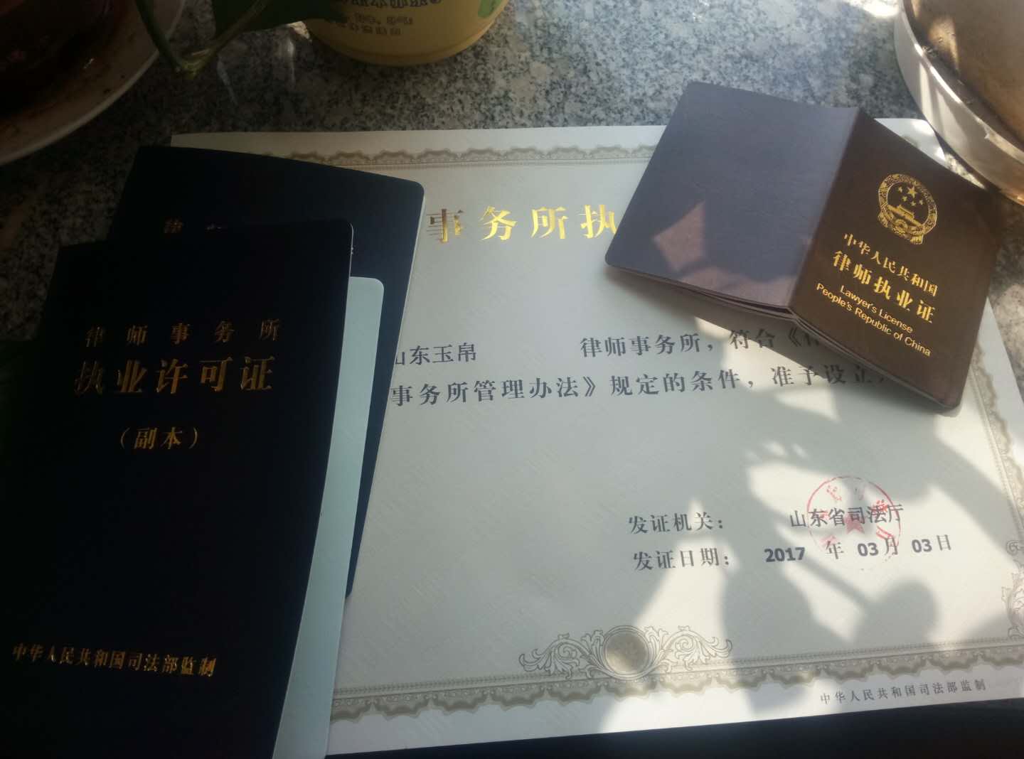 旅途辛酸劳顿无需多言,济南火车站的两个赛百味三明治也让我难以忘怀,终于赶到了经十路上的司法厅,拿到了梦寐以求的五本证书,美滋滋的打开一看——山东XX律师事务所?看来是我忙中出错拿到别人家的“出生证”啦,亏得没走远,赶紧回去换,顺便微信群里邀个功……